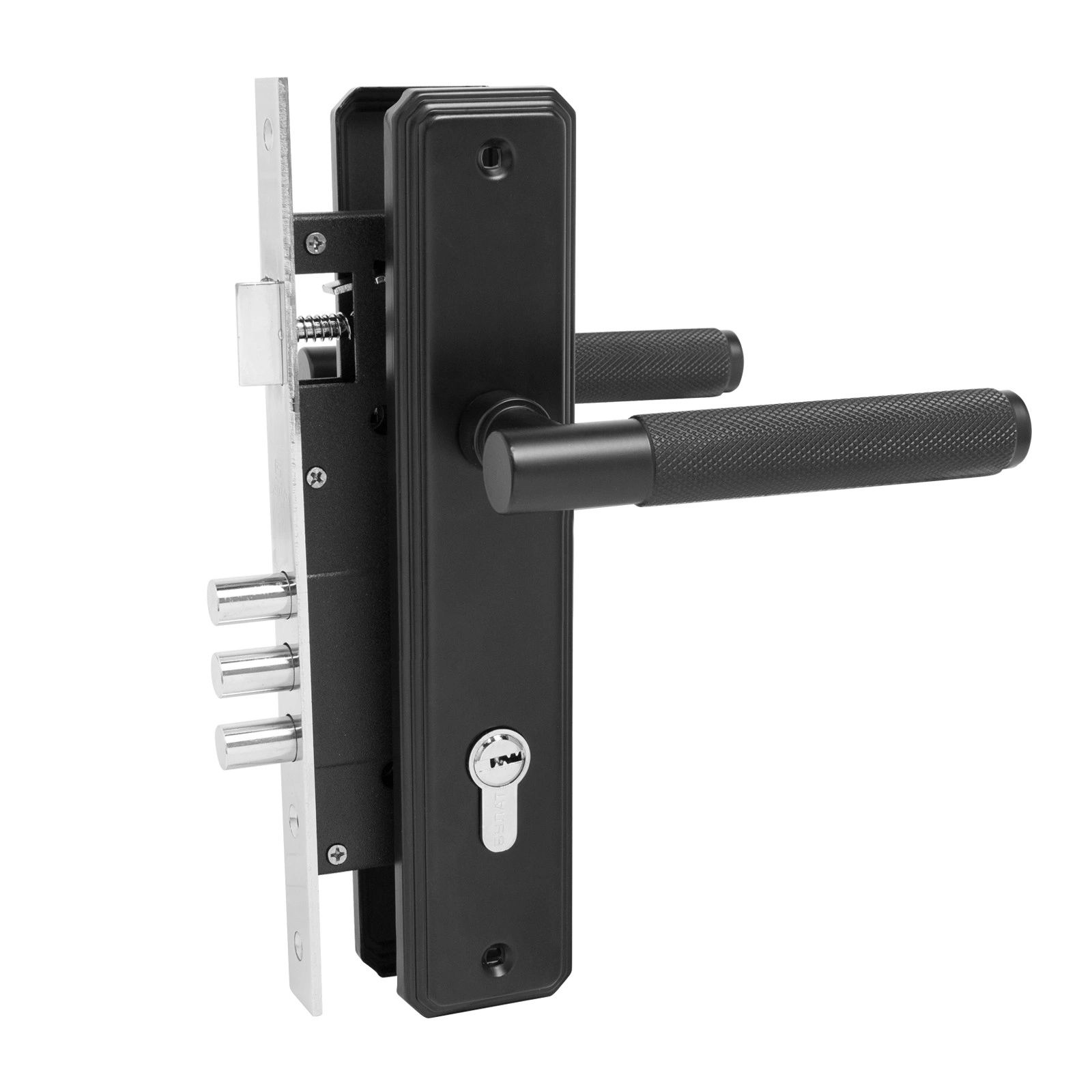 Универсальная защелка. Стальной корпус с подшипником, покрыт полимерной краской. Межосевое расстояние 85 мм. Удаление ключевого отверстия 45 мм. Материал ручек - стальной пруток, планки – сталь.