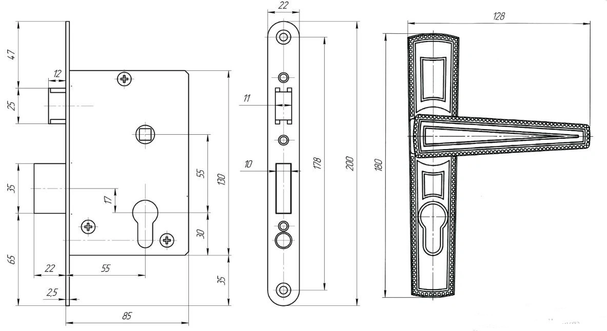 Предназначен для установки в деревянные двери толщиной 40-50мм, правого и левого открывания.