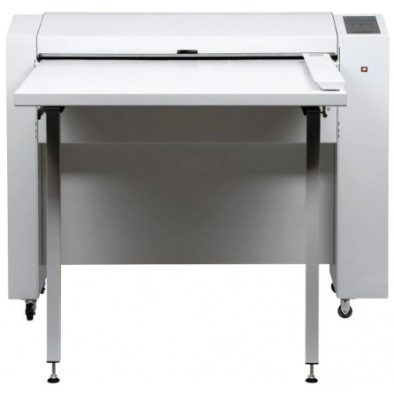 Чертежи подаются с большого стола и прижимаются к правому краю - обеспечивается ровная подача даже длинных документов. Стол подачи документов может убираться для экономии пространства. После сложения четырехметровой длины складыватель делает пропуск 420 мм, выводит сложенную часть документа в приемную корзину, а затем продолжает складывать очередные 4 метра