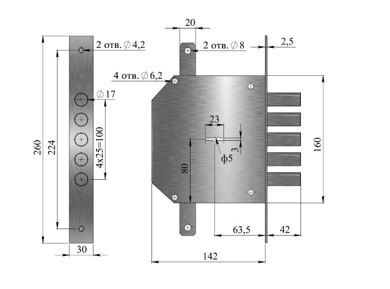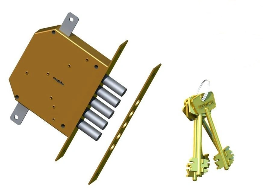 Запирание поворотом ключа обеспечивает ригель, имеющий 5 пальцев диаметром 17 мм с вылетом 42мм. Дополнительные тяги имеют ход 20 мм и обеспечивают запирание двери вверху и внизу.