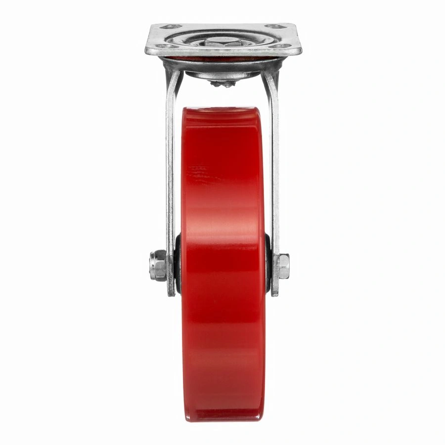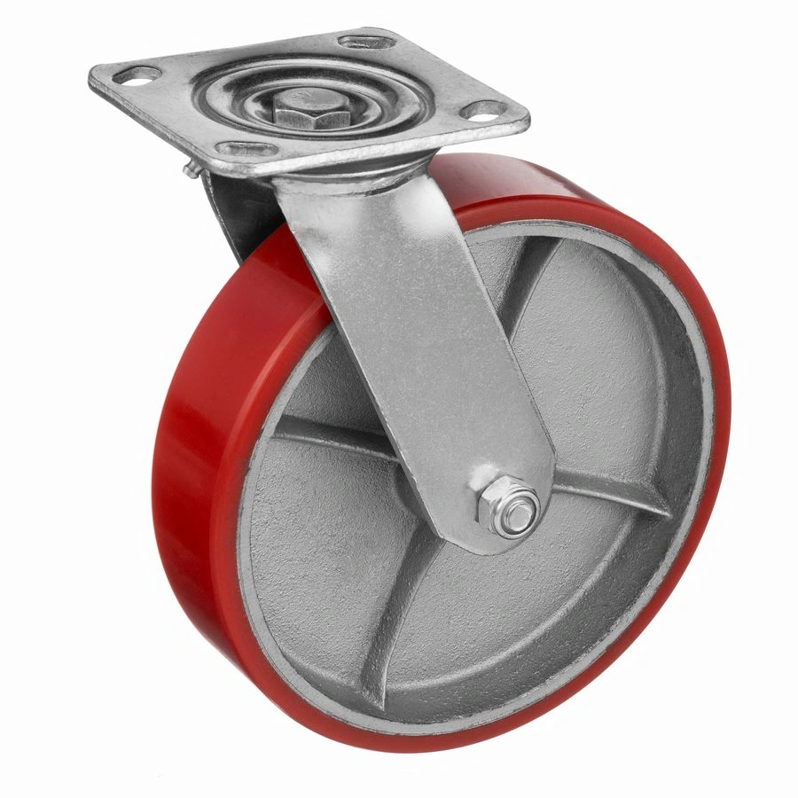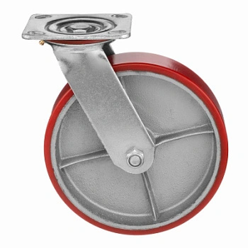 Колесо 1043-200, диаметр 200мм., чугун или полиуретан, поворотное, игольчатый подшипник. Грузоподъемность 460кг. Колесо полиуретановое, центр из литого чугуна. В оси колеса-игольчатый подшипник. Поворотный кронштейн имеет двурядный подшипник. Наличие масленки позволяет периодически обслуживать колесо. Крепление площадка под 4 болта. Колеса полиуретановые с чугунным сердечником широко применяются на бетонных полах преимущественно внутри помещений. Широко используются на тележках, строительных лесах и другом оборудовании, где требуется высокая грузоподъемность. при длительном нахождении под большой нагрузкой не деформируются. Возможно использование вне помещении на твердых покрытиях. Температура эксплуатации от -20 до +50С.