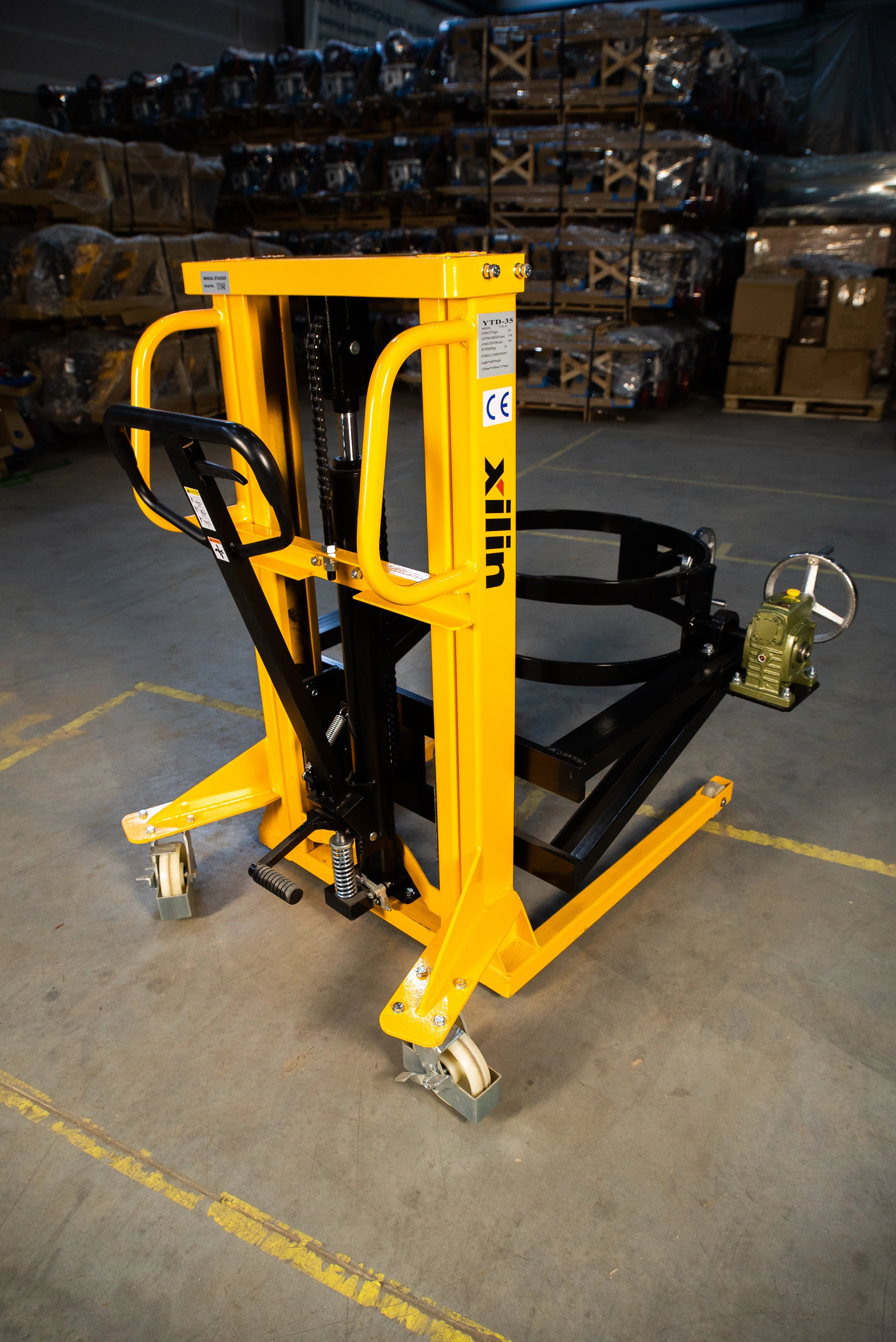 Штабелер-бочкокантователь ручной гидравлический XILIN 350 кг 1945 мм YTD-35- ручной штабелер, предназначенный для перевозки складирования и кантования жидких или сыпучих материалов, тарированных в бочки. Принцип работы штабелера прост: бочка захватывается и крепится с помощью специального захвата, в штабелере предусмотрен механизм кантования. Грузоподъемность бочкокантавателя составляет 350 кг и высота подъема до 1945 мм, что позволяет складировать бочки в или 3 яруса в зависимости от того, какой высоты стеллажи используются для хранения. Подходит для работ на складах, на фасовке и в производственных цехах. Преимущества XILIN YTD-35: - Штабелер YTD специально разработан для транспортировки, подъема, наклона и переворачивания бочек - Универсальный механизм крепления и кантования обеспечивает сохранность бочек - Ножной стояночный тормоз на обоих ведущих колесах надежно фиксирует штабелер обеспечивая безопасность работ - Защитная рама на поворотных колесах убережет их от повреждений и продлит срок службы - Подъем груза может осуществляться как рукой, классической ручкой, так и ногой с помощью дополнительного рычага, что дает возможность оператору выбрать удобный ему способ или чередовать их для меньшей нагрузки - Высокоэффективный насос значительно облегчает управление грузом В нашем интернет магазине вы можете выгодно приобрести бочкокантователи по бюджетной цене. При выборе штабелера - бочкокантователя обращайте внимание на его основные эксплуатационные характеристики, которые важны для вас. Если нужна консультация специалиста, воспользуйтесь удобным для вас способом связи для получения исчерпывающей информации по выбору штабелера. Складская техника производства XILIN– это новейшие разработки в складской технике. Инновации, эффективность и безопасность – главные критерии для выпуска новой продукции.