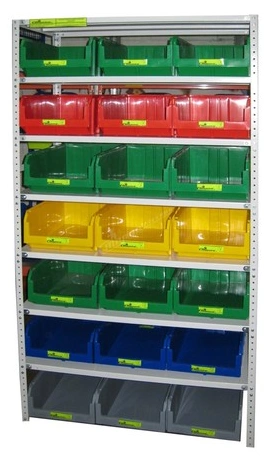 Полочный стеллаж с ударопрочными ящиками типа V подойдет для хранения инструмента, деталей, запчастей или различных мелочей. Стеллаж идет в комплекте с ударостойкими пластиковыми ящиками серии "V" из полипропилена (18 ящиков). Цвета ящиков можно указать в заказе. Дополнительно можно установить 3 ящика на пол (в стоимость не входят и продаются отдельно).