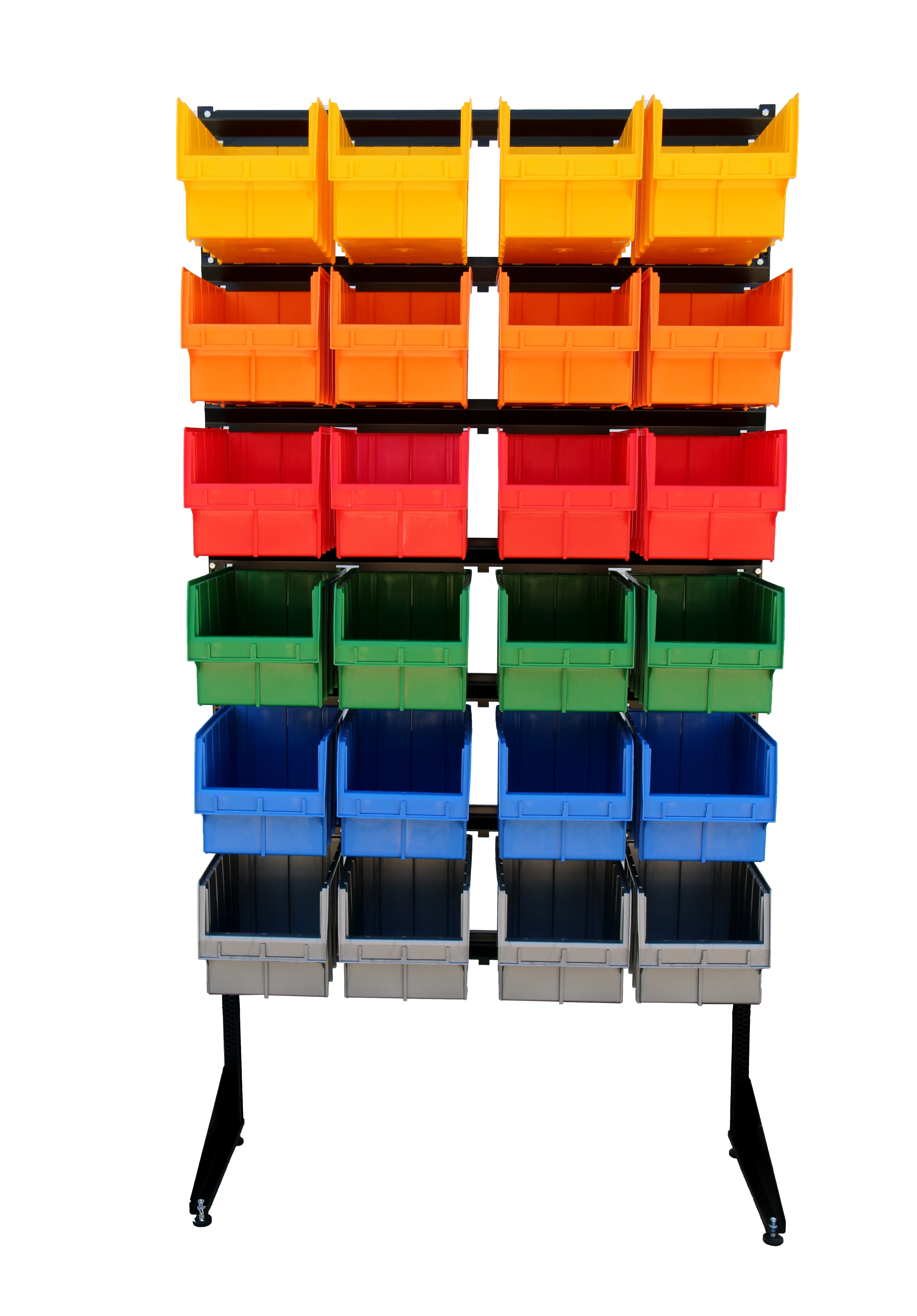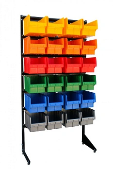 Цвета ящиков: оранжевый, желтый, красный, зеленый, синий, чёрный У ящика предусмотрен отсек для написания содержимого (место для шильдика), на передней скошенной стенке, захват, для быстрого съема со стеллажа, ребра жесткости на боковых стенках, сплошное дно. Материал - полипропилен.