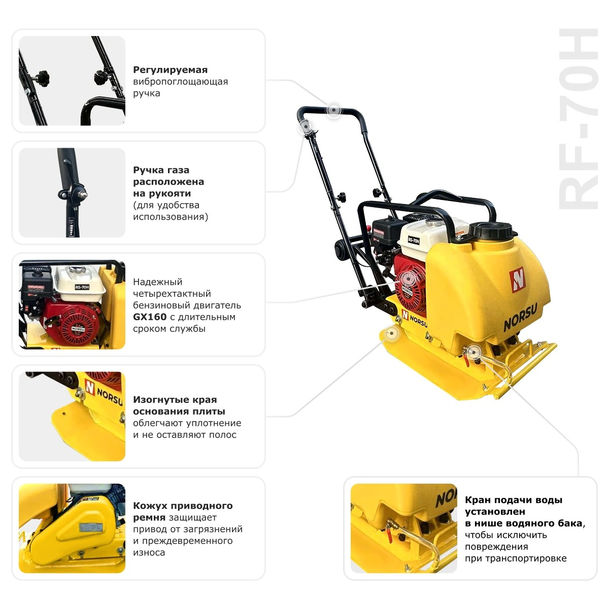 Прямоходная виброплита NORSU RF-70TH — это универсальная модель, которая отличается эффективностью и высоким качеством исполнения. Объем топливного бака составляет 3.6 л. Основание плиты литое, устойчивое к деформациям и износу. Наличие системы орошения позволяет эксплуатировать технику при укладке асфальта. Допускается использовать RF-70TH для укладки тротуарной плитки (для этих видов работ необходимо отдельно приобрести полиуретановый коврик).