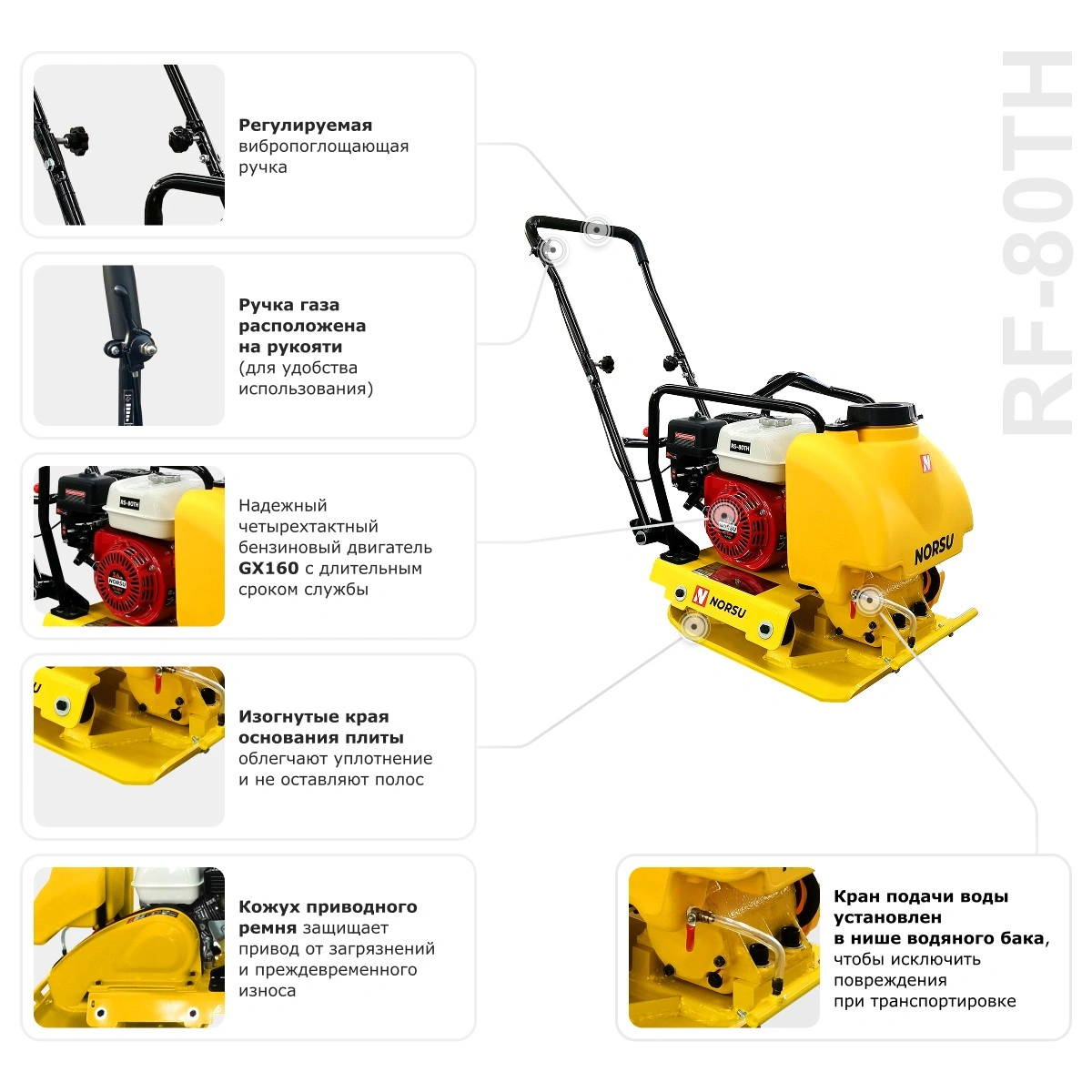 Прямоходная виброплита RF-80TH бренда NORSU подходит для уплотнения песчаных и гравийных оснований, укладки асфальта, выравнивания брусчатки, выполнения ремонта дорожных покрытий. Глубина уплотнения равна 300 мм. Топливный бак рассчитан на объем 3.6 л. Встроенные колеса позволяют выполнять быстрое перемещение плиты между рабочими участками. Техника малогабаритная, может использоваться в местах, где нет доступа более крупным аналогам. Область применения: благоустройство территорий, прокладка инженерных коммуникаций, выполнение дорожных работ.