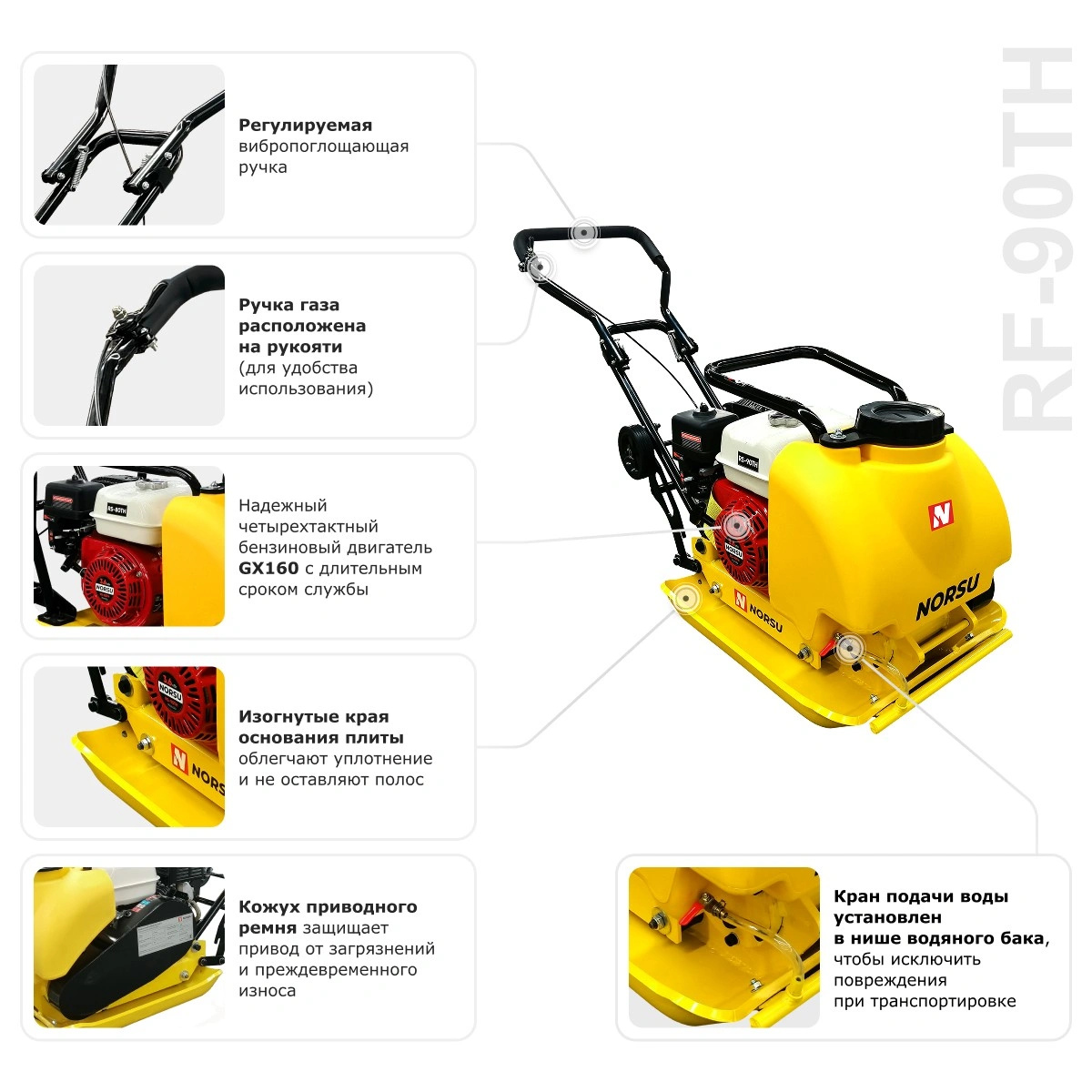 Прямоходная виброплита RF-90TH бренда NORSU подходит для уплотнения песчаных и гравийных оснований, укладки асфальта, выравнивания брусчатки, выполнения ремонта дорожных покрытий. Глубина уплотнения равна 300 мм. Топливный бак рассчитан на объем 3.6 л. Встроенные колеса позволяют выполнять быстрое перемещение плиты между рабочими участками. Техника малогабаритная, может использоваться в местах, где нет доступа более крупным аналогам. Область применения: благоустройство территорий, прокладка инженерных коммуникаций, выполнение дорожных работ.