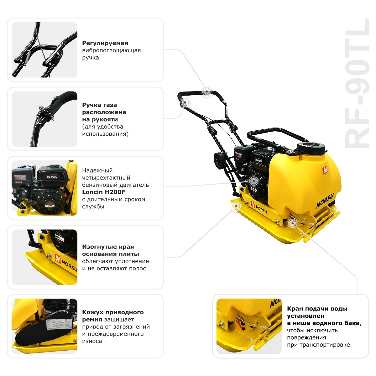 Прямоходная виброплита RF-90TL бренда NORSU подходит для уплотнения песчаных и гравийных оснований, укладки асфальта, выравнивания брусчатки, выполнения ремонта дорожных покрытий. Глубина уплотнения равна 300 мм. Топливный бак рассчитан на объем 2.5 л. Встроенные колеса позволяют выполнять быстрое перемещение плиты между рабочими участками. Техника малогабаритная, может использоваться в местах, где нет доступа более крупным аналогам. Область применения: благоустройство территорий, прокладка инженерных коммуникаций, выполнение дорожных работ.